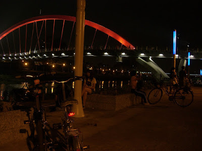 回程的路上感到有些許的疲倦,再加上天色漸暗,我們就乘著風慢慢的騎,在快騎回起點「彩虹橋」之前有一段路,旁邊都是圓柱狀的彩色燈,將這一段路點綴得特別漂亮,不知不覺我們的腳步越踩越快,很快的就回到了起點,在此稍微休息,也為本次的行程畫下了完美的句點。